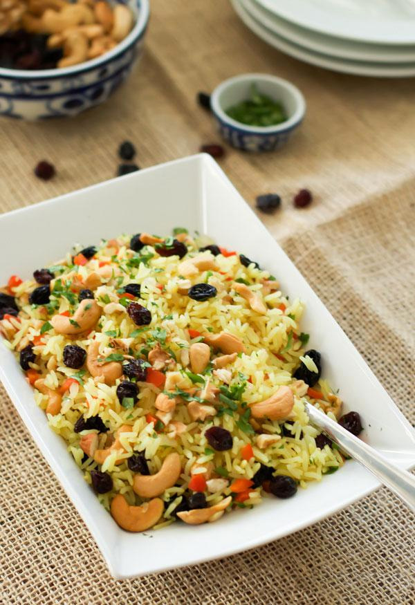 Arroz integral multigrãos colorido e aromático, com tofu defumado, pimentão vermelho, cenoura ralada, ervilha, milho verde, uvas passas, amêndoas picadas, azeitona e cebolinha. Um acompanhamento festivo e completo.
