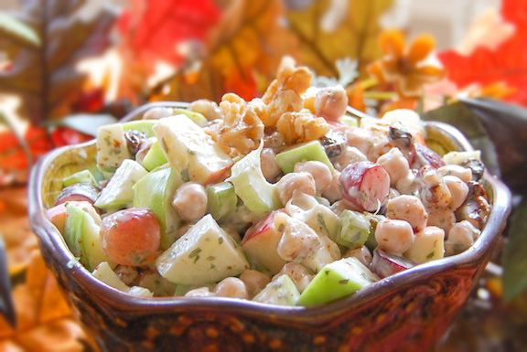 Salada fresca e crocante com grão-de-bico, cenoura, maçã verde, amêndoas defumadas, salsão e alface americana, envolvida em um molho de maionese, mostarda e melado. Cerca de 1 kg — serve de 6 a 8 pessoas.